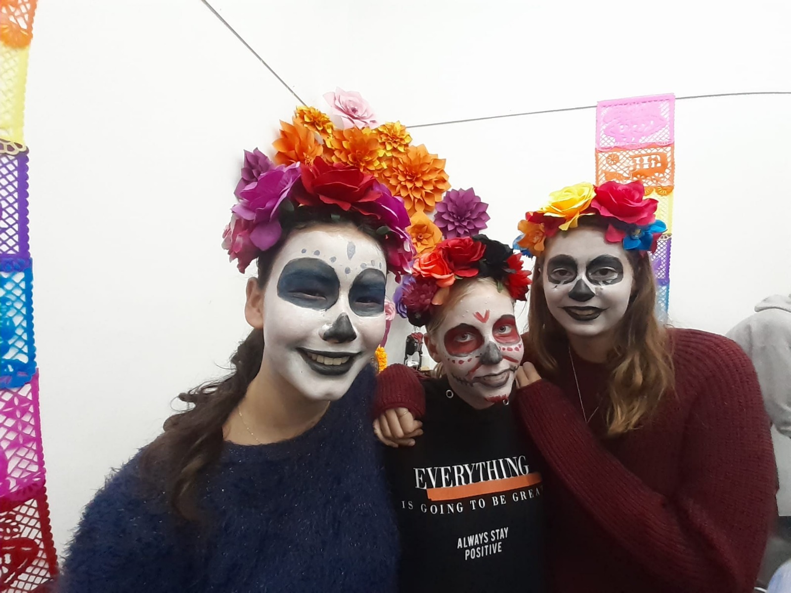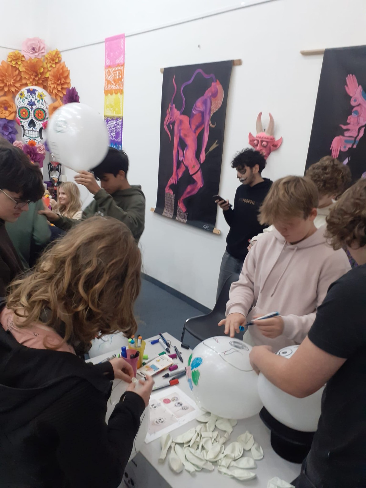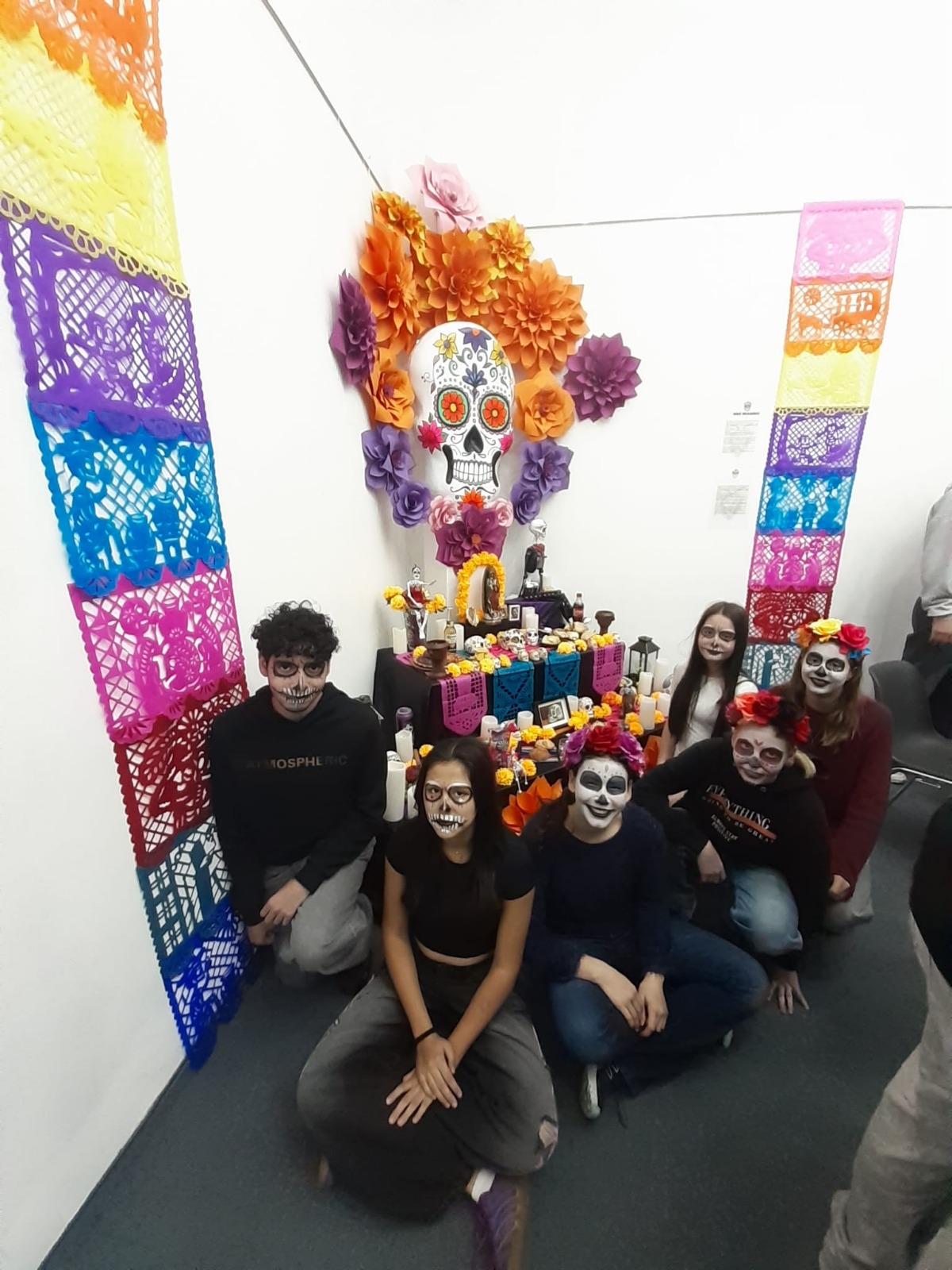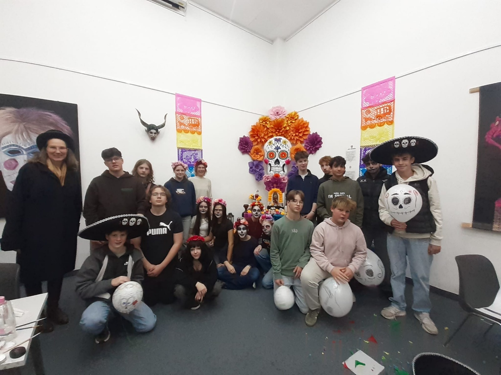 Am 21.10.2024 verbrachten die Spanischlernenden der 5A und 5B mit Mag. Brigitte Lemmel und Mag. Verena Grafl den Vormittag im Lateinamerikainstitut. Nach zahlreichen Informationen zum „Día de los muertos“ (Tag der Toten) in Mexiko gab es unterschiedliche Stationen zum Fest: Es wurden Bilder gemalt und Luftballons bemalt, Scherenschnitte gemacht, dekorative Blumen gebastelt, Totenköpfe aus Zucker verziert, wunderschöne „catrinas“ geschminkt und ein Altar verziert. Eindrücke, die bleiben! (V. Grafl)