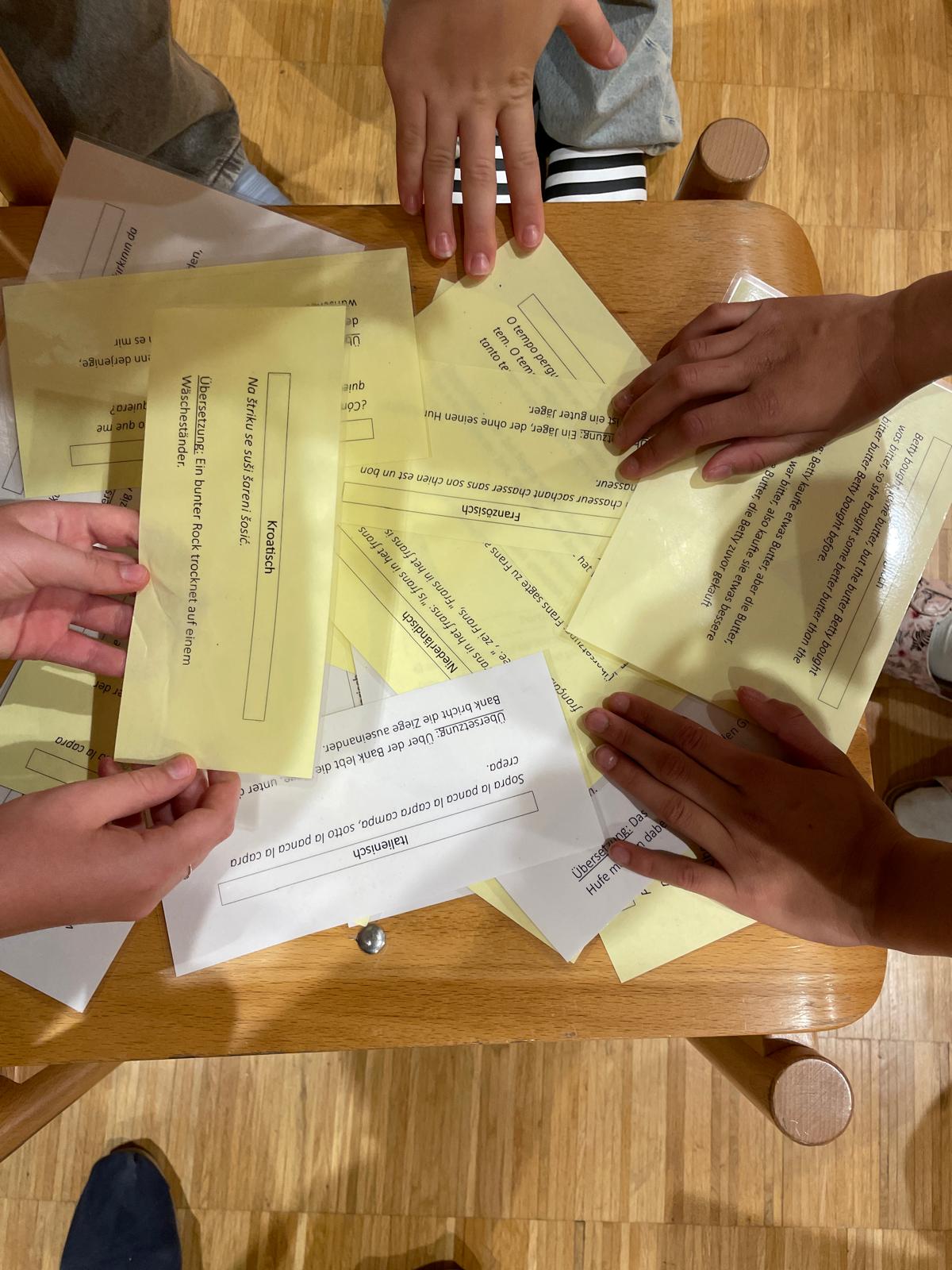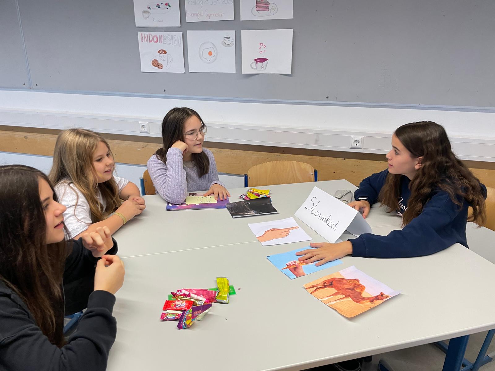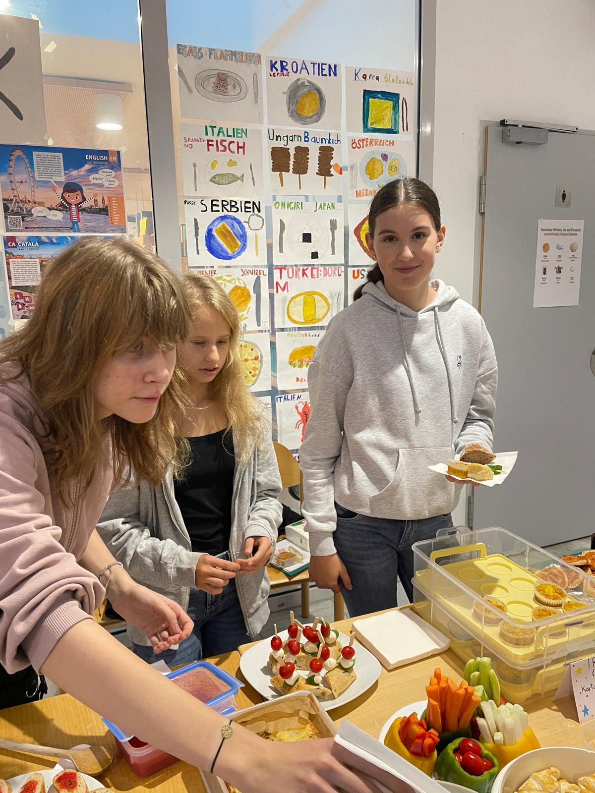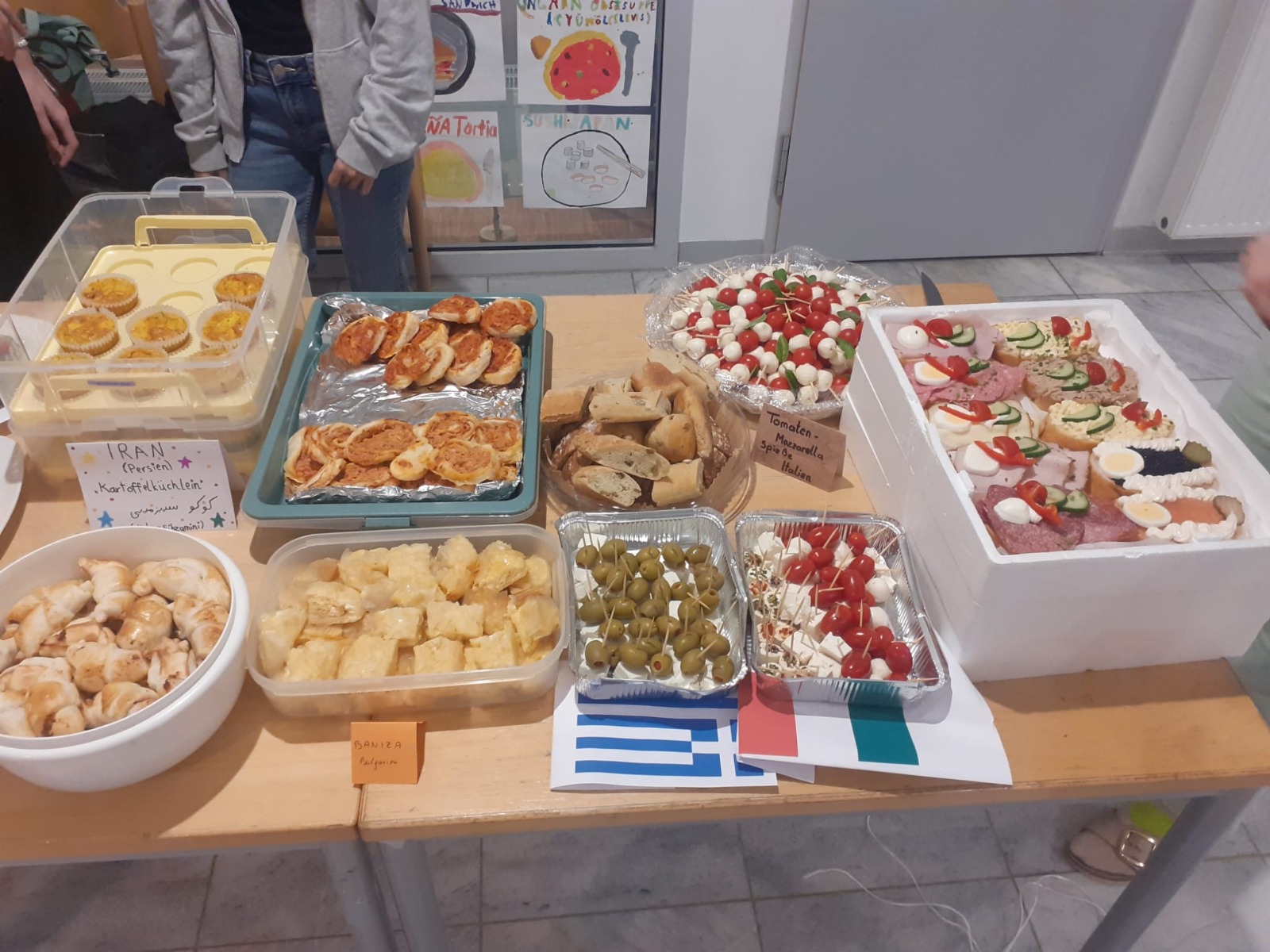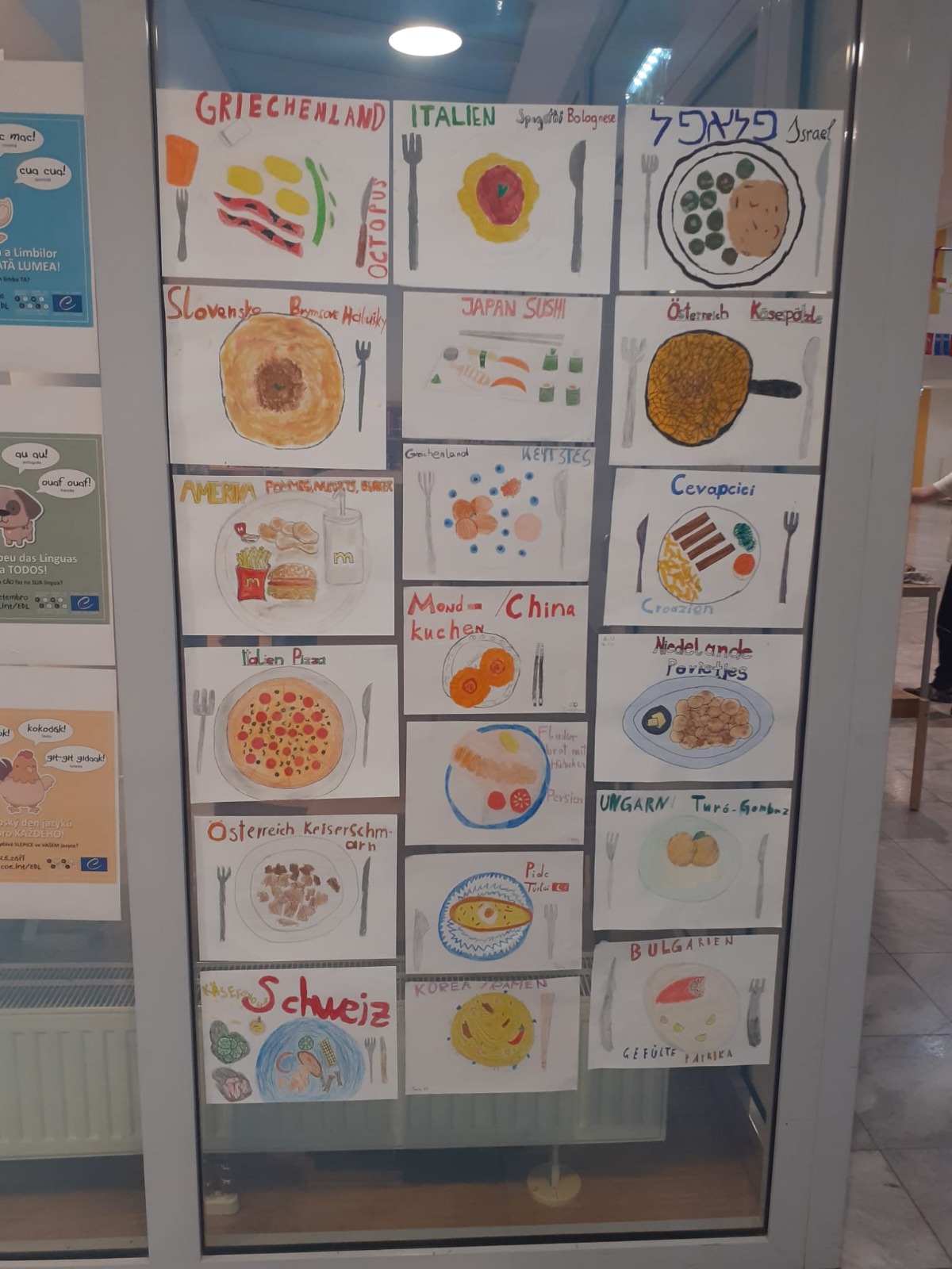 Neben einem internationalen Buffet für alle gab es am 26. September auch Stationenbetrieb für die 2. und 3. Klassen. Dabei erhielten die Schüler:innen zum Beispiel einen ersten Einblick in einige der Sprachen, die von Schüler:innen der 5C gesprochen werden: An verschiedenen Stationen wurden die Sprachen ausprobiert und geschrieben oder die kulinarischen Spezialitäten der jeweiligen Länder vorgestellt. Weiters wurde ein irischer Volkstanz getanzt und mit „Hupf in Gatsch“ in den Wiener Dialekt geschnuppert.