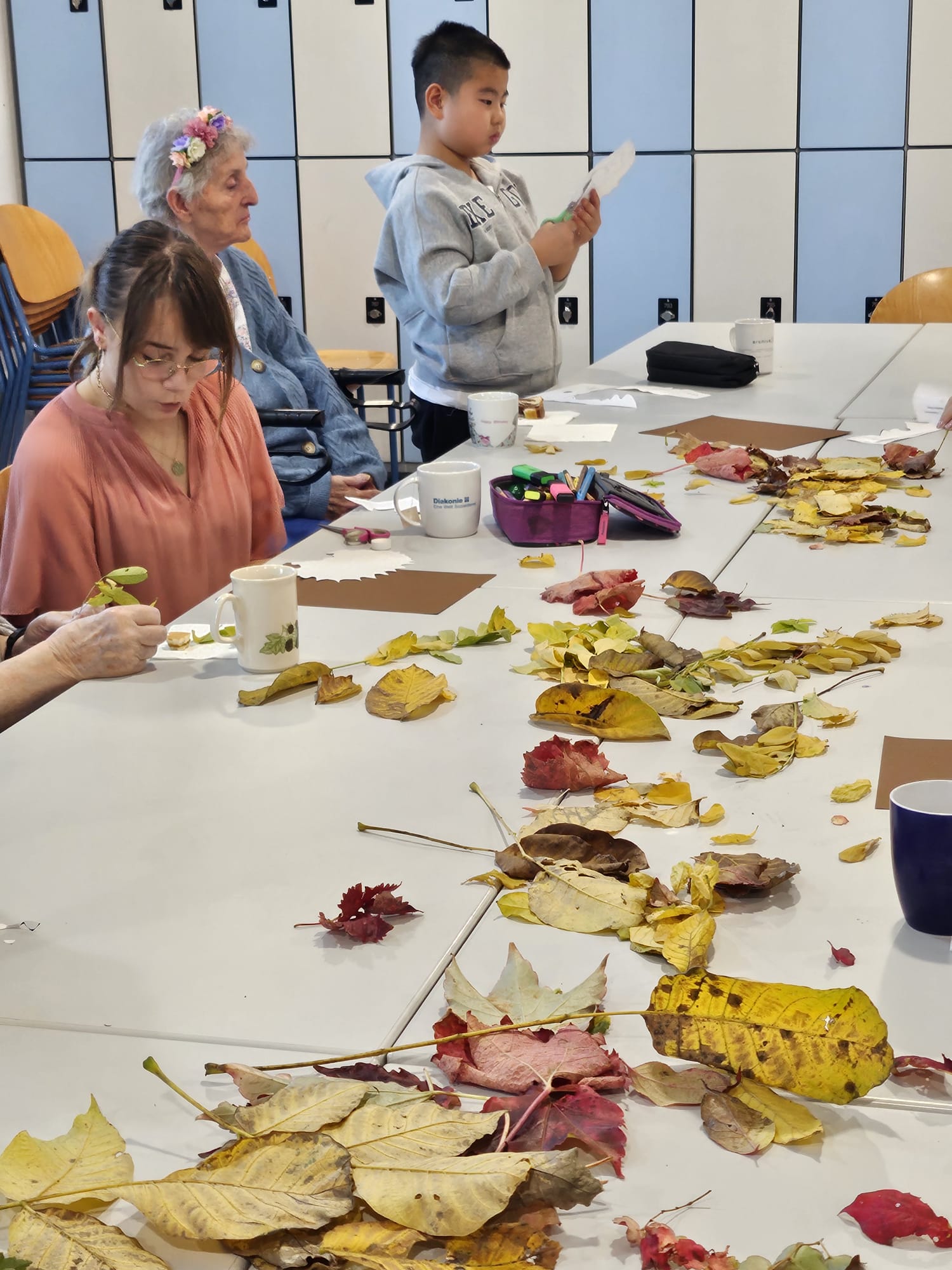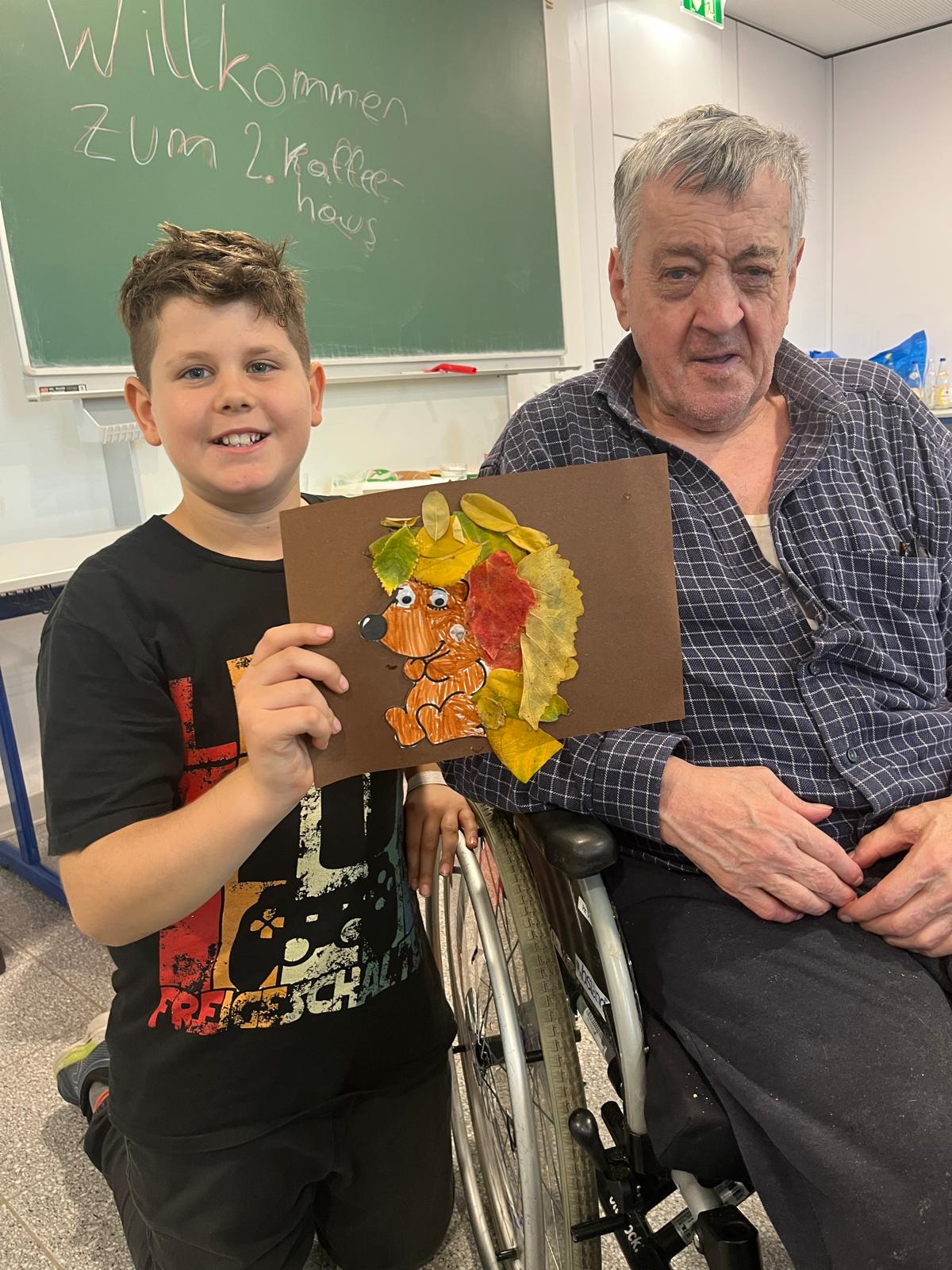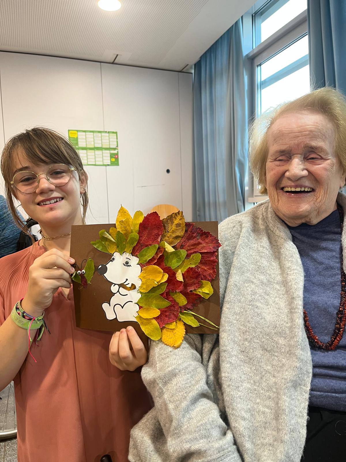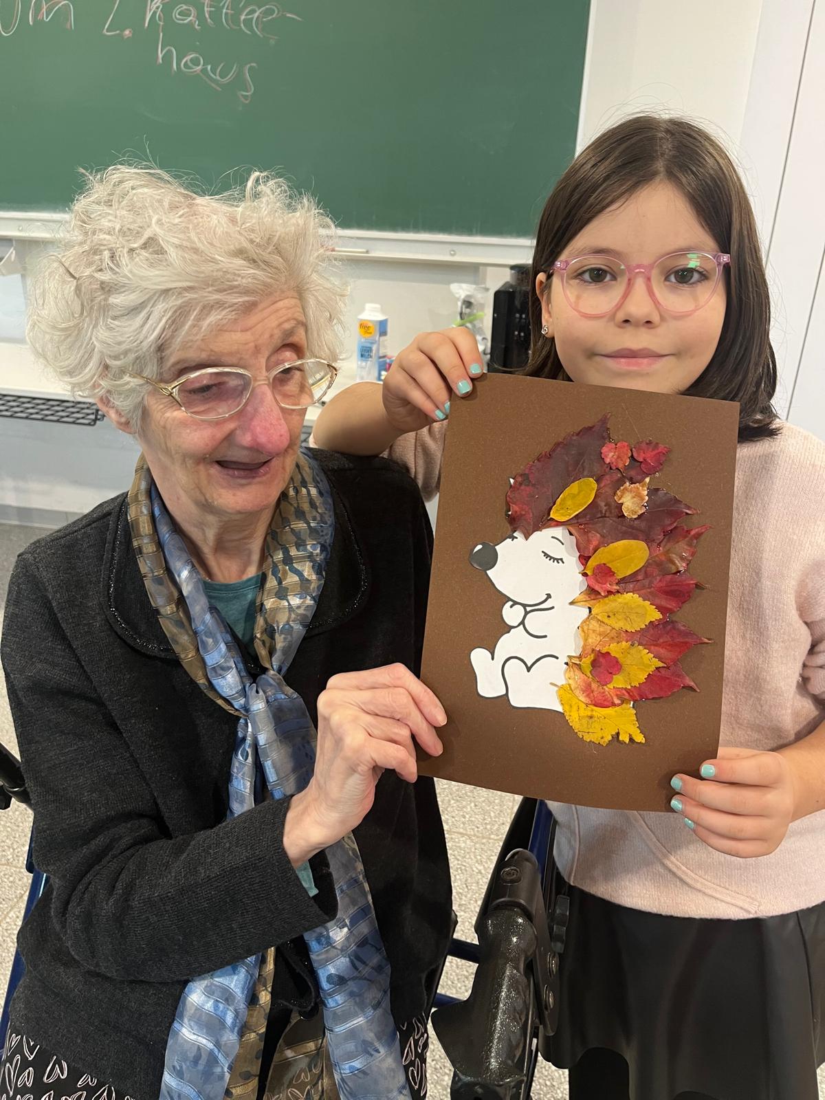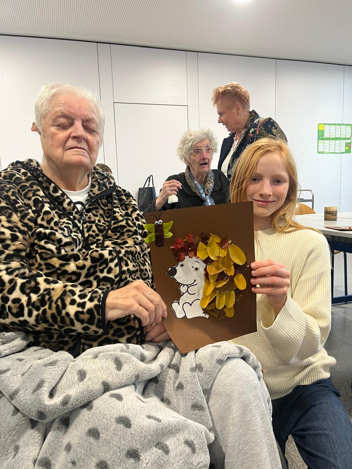 Nach den Herbstferien starteten wir mit den Schüler:innen der UÜ Gelebte Diakonie mit dem monatlich stattfindenden, allseits beliebten Caféhaus. Nach Café und Kuchen begannen die Kids mit den Bewohner:innen der HGs gemeinsam mit einer herbstlichen Bastelarbeit. Es galt eine Igelschablone auszuschneiden und auf Tonpapier aufzukleben. In der Zwischenzeit hatten unsere Gäste ausreichend Zeit, unter den mitgebrachten bunten Blättern zu gustieren und jene auszuwählen, die das Stachelkleid des Igels bilden sollten. Angeregte Gespräche über Größe, Farbe, Form und der Anordnung der Blätter folgten. Zufrieden präsentierten sich die Teams der Fotografin. (STAE)