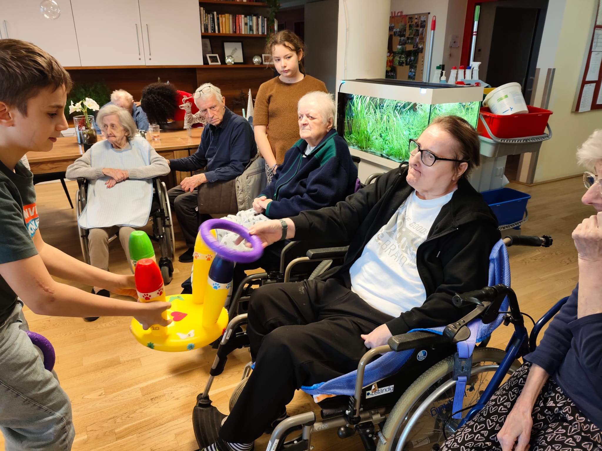 Die Schülerinnen verbrachten gemeinsam mit den Bewohner:innen einen Spielenachmittag im 4.Stock. Wir haben XXL Mikadostäbe mitgebracht und die Mädchen versuchten, die Stäbe ohne „wackeln“ abzuheben und das Spiel aufzulösen. Dabei wurden die Kids tatkräftig von den Bewohner:innen mit Tipps und Applaus unterstützt. Auch Bambi kann Stäbe vom Boden aufnehmen und hat daher eifrig mitgespielt.
