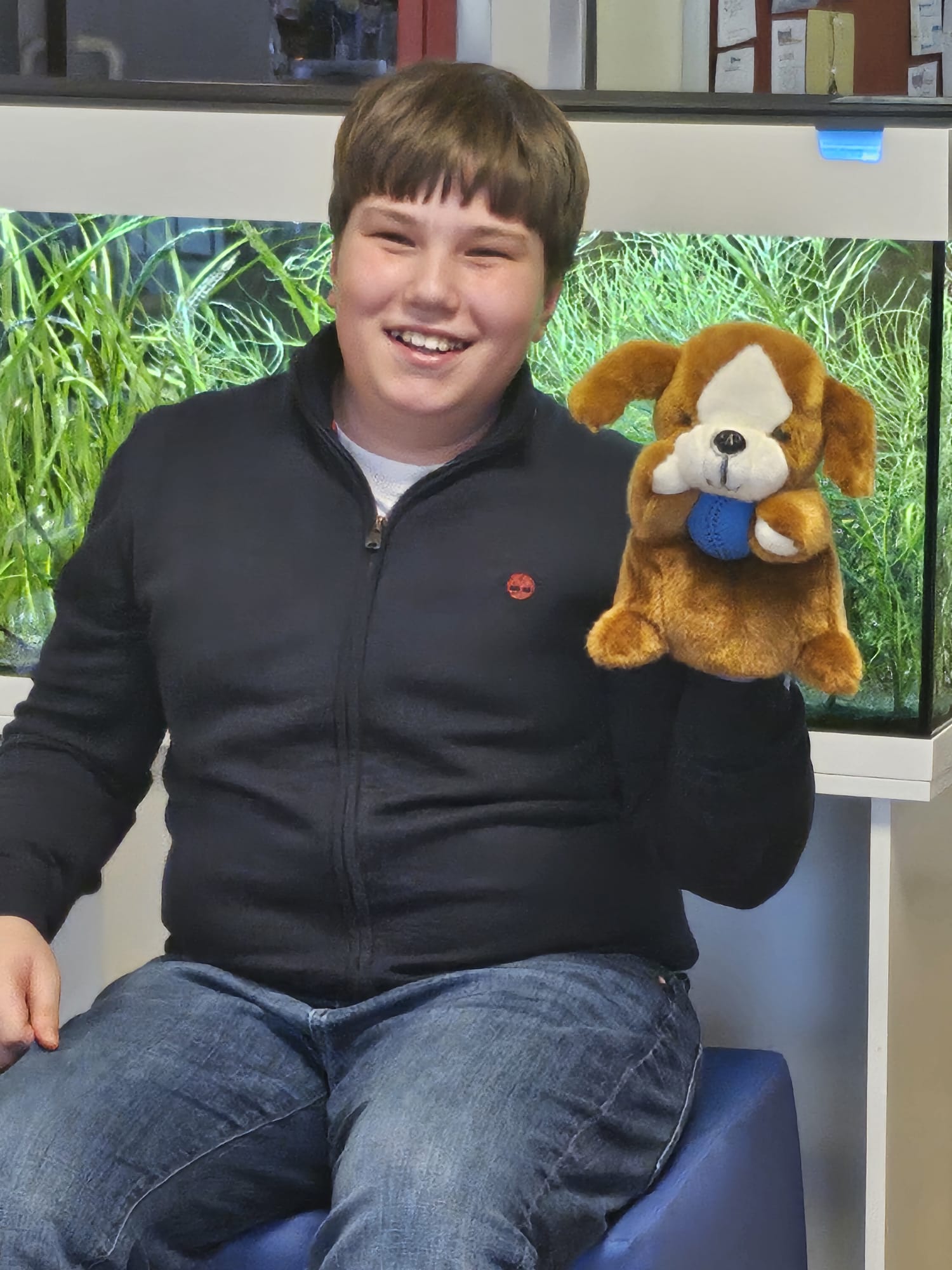 Außerdem war wieder Bambi in ihrer Eigenschaft als TBH im Einsatz. In der HG 4 ergab sich eine bunt gemischte Runde aus Bewohner:innen und Schüler:innen, die gemeinsam Zahlen mit Hilfe von biegsamen Leckerliröhren formten. Bambi wies ihren Klient:innen mittels Pfotentarget die nächste Vorlage zu. Alle hatte der Ehrgeiz gepackt, alle wollten möglichst viele Zahlen formen. Die Schüler:innen unterstützten eifrig, es wurde viel gelacht, verglichen, angespornt und gelobt.