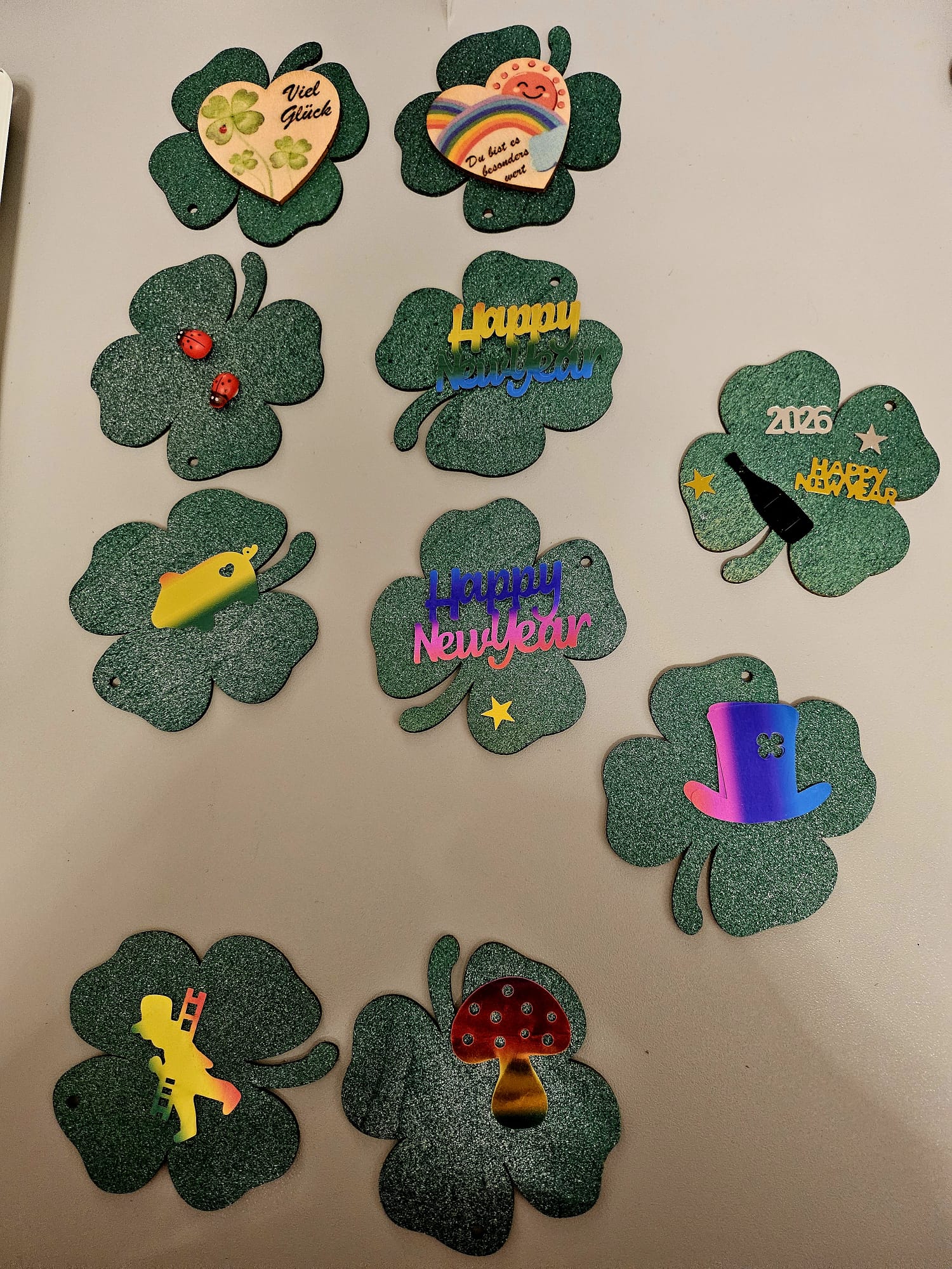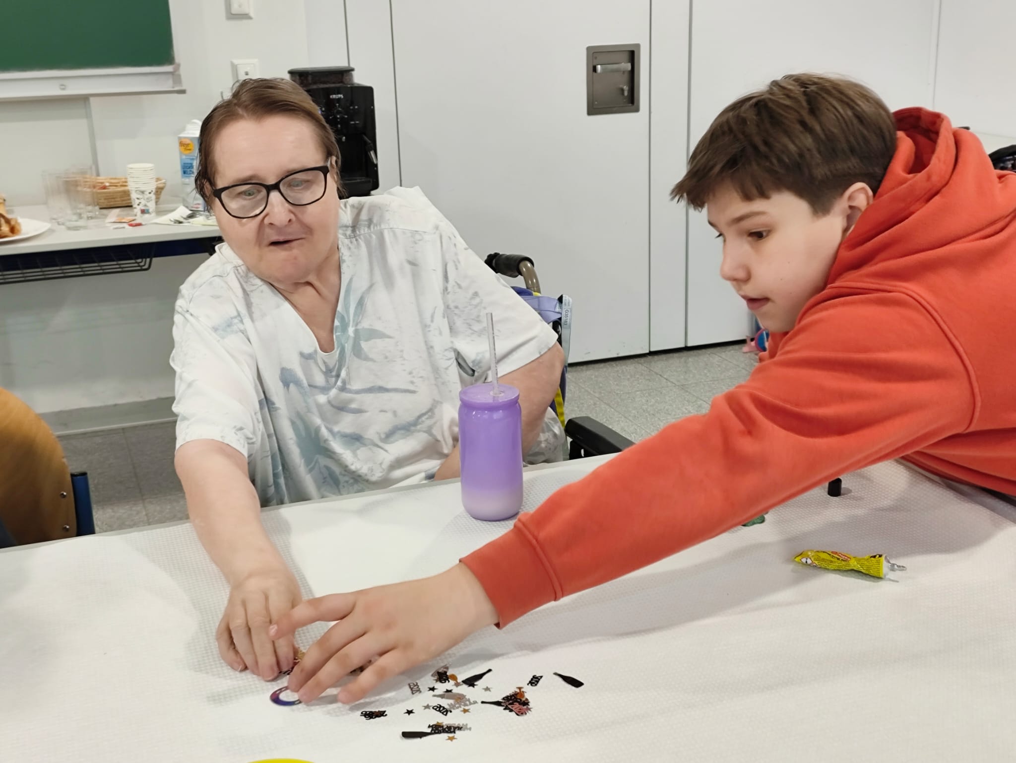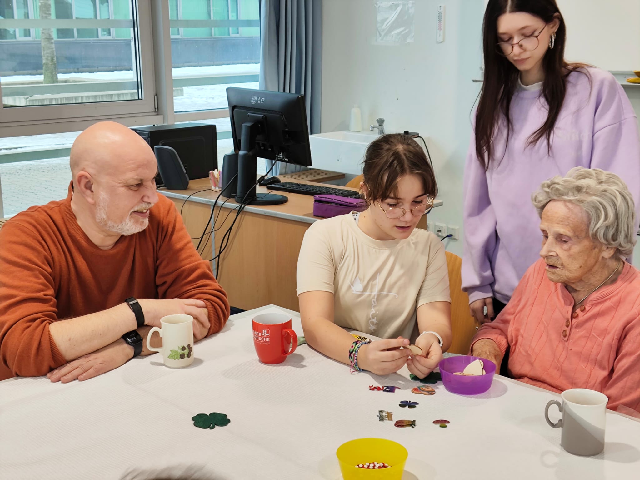 Nach Cafe und Kuchen starteten unsere Schüler:innen gemeinsam mit den Bewohner:innen der HG mit einer Neujahrsbastelarbeit. Dabei würden Holzkleeblätter, die grün eingefärbt waren, mit verschiedenen Glücksbringern beklebt. Es entstand eine angeregte Plauderei und Diskussion darüber, welche der zahlreichen Glücksbringer ausgewählt werden sollten.