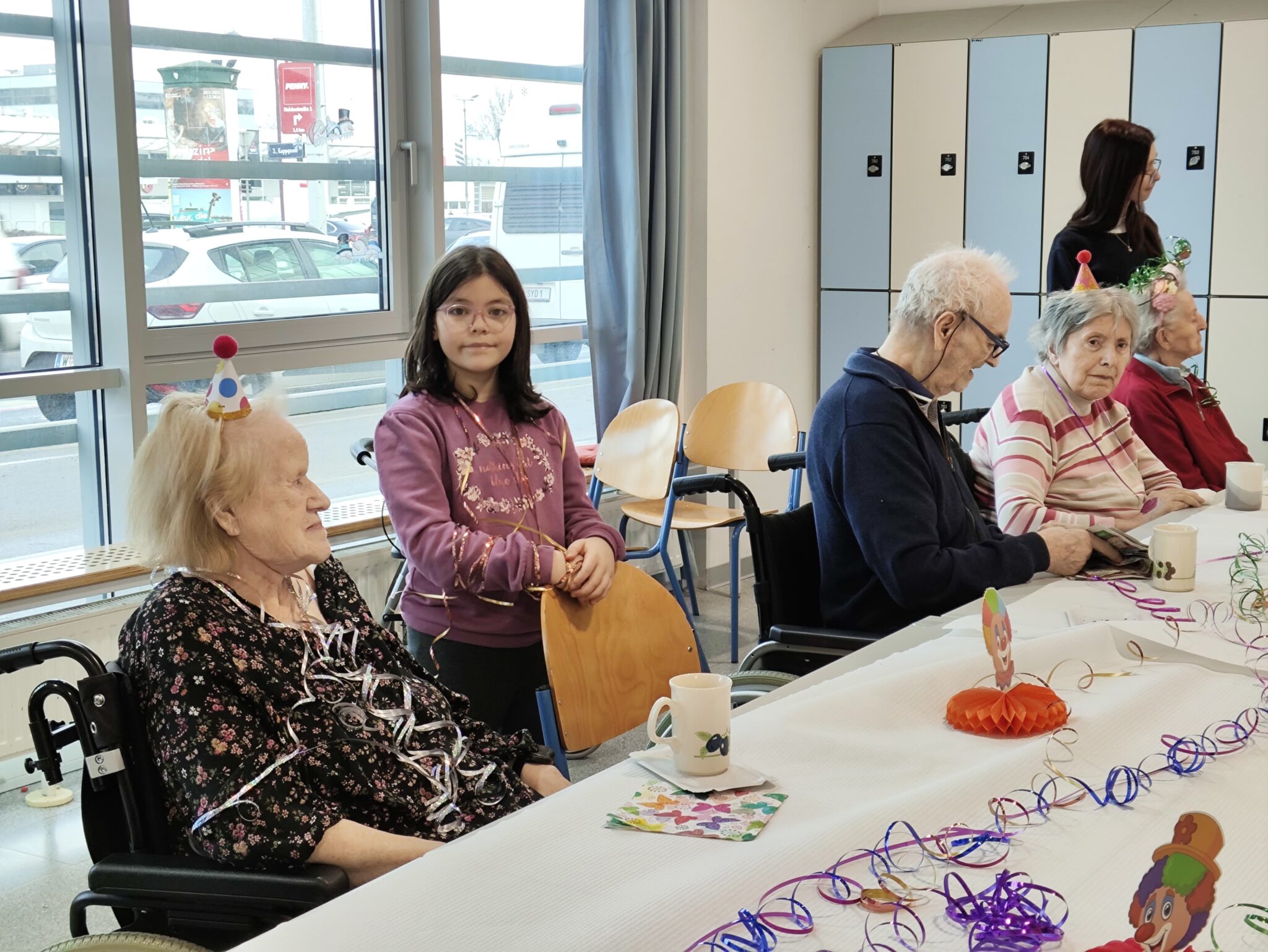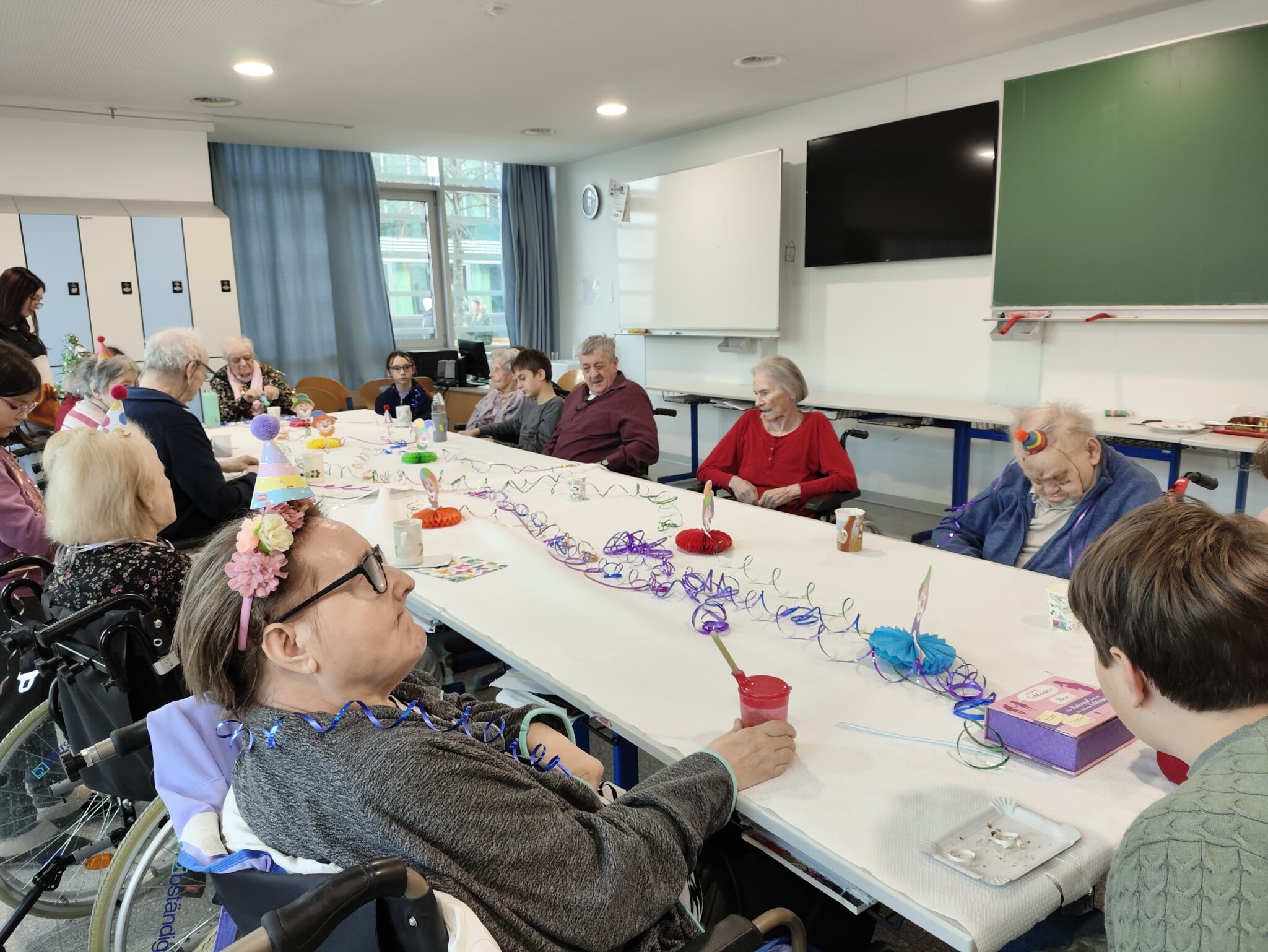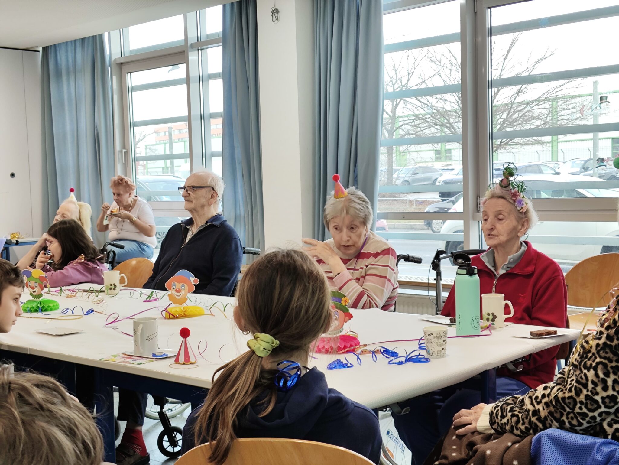 Rechtzeitig zum Höhepunkt der diesjährigen Faschingssaison luden Lehrende und Kinder Bewohner:innen der Hausgemeinschaften zur Faschingsfeier. Ein mit allerlei Dekomaterial geschmückter Tisch wartete auf die Besucherinnen und Besucher. Die Schüler:innen verteilten kleine bunte Hütchen und glitzernde Girlanden an die Gäste, rote Herzchen wurden auf den Handrücken aufgemalt. Nach Cafe und Kuchen startete Frau Mag.a Wolf ein Liederrätsel, bei dem es galt, Textsicherheit zu beweisen, das Lied gemeinsam anzusingen und den Interpreten zu erraten. Unsere zahlreichen Gäste (Zweithöchste Besucherzahl im zehnjährigen Bestehen) genossen die Musik, die Felix anspielte und bewegten sich im Takt. Es war ein heiterer musikalischer Nachmittag, den alle genossen. Die TBH Bambi war auch anwesend, ließ sich gerne streicheln und verfolgte aus sicherer Entfernung von ihrer Ruhedecke aus die Sangeskünste unserer Gäste. (STAE)